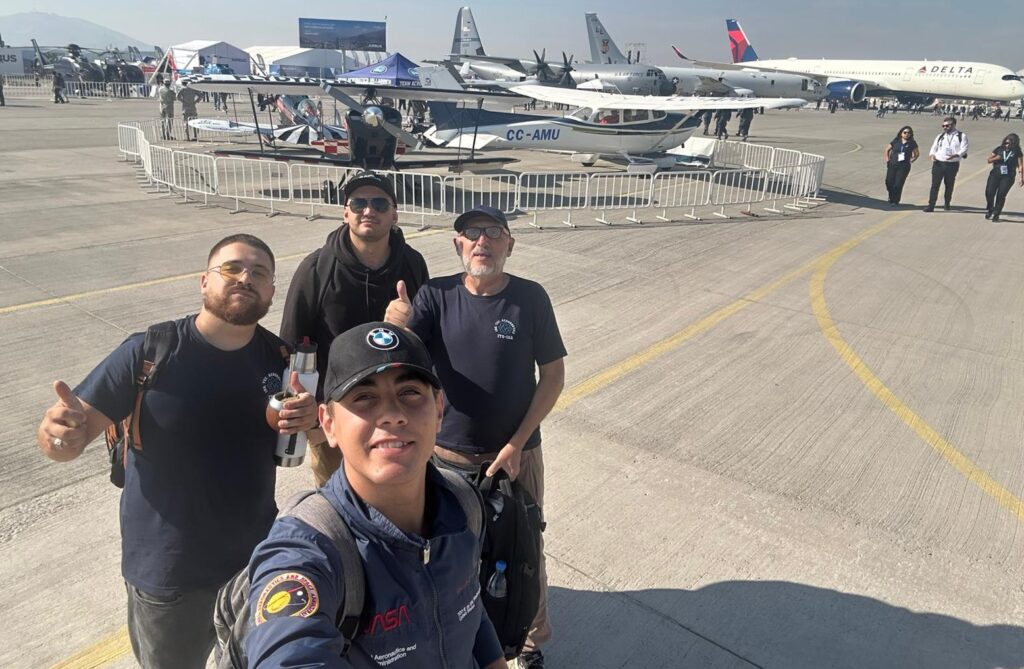 Federico Alesandri, Cristian Barreiro, Ignacio Cardoso y Joaquín Viazzo, junto al docente Domingo Maiolo fueron, este 9 de abril, a la Feria Internacional del Aire y del Espacio (FIDAE) que se realizó en la Base Aérea Pudahuel de Santiago de Chile.